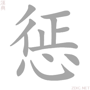 英語 punish, reprimand; warn 德語 disziplinieren(V),strafen(V) 法語 punir,châtier 惩 詳細解釋詳細字義 ◎ 懲 懲 chéng 〈動〉 (1) (形聲。從心,徵聲。本義:警戒;鑑戒) (2) 同本義 [be on the alert against;guard against;warn] 懲,戒也。——《玉篇》 懲,恐也。——《廣雅》 則民有所懲。——《禮記·表記》 不懲其心。——《詩·小雅·節南山》 (3) 又如:懲毖(受創於前,當戒慎於後);懲糾(告戒督察);懲示(警告) (4) 處罰 [penalize;punish] 懲惡而勸善。——《左傳·成公十四年》 懲肆而去貪。——《左傳·成公三十一年》 (5) 又如:懲勸(責罰與獎賞);懲惡勸善(貶斥壞人,獎勵好人);懲創(懲戒;警惕) (6) 改定 [change] 變律改經,一皆懲革。——陸倕《新刻漏銘》 (7) 剋制;制止 [restrain;stop]。如:懲忿(剋制忿怒) 常用詞組 懲辦懲處懲罰懲戒懲前毖後懲一戒百懲一警百 【卯集上】【心】懲·康熙筆画:19 ·部外筆画:15 懲 《康熙字典》(康熙字典未收錄“惩”字頭,請參考“懲”字。)【卯集上】【心】懲·康熙筆画:19 ·部外筆画:15 【唐韻】直陵切【集韻】【韻會】持陵切, 又叶仲良切,音長。【屈原·離騷】民生各有所樂兮,余獨好修以爲常。雖體解吾猶未變兮,非余心之可懲。 【卷十】【心】 懲 《说文解字》(說文解字未收錄“惩”字頭,請參考“懲”字:)【卷十】【心】 『說文解字』 㣻也。从心徵聲。直陵切 『說文解字注』 㣻也。二篆爲轉注。古亦叚徵爲懲。从心。徵聲。直陵切。六部。 惩 音韻方言国际音标tʂʰəŋ˧˥ 粤语cing4 官话 晋语 吴语 湘语 闽语 粤语 平话 客语 韵书 上古音 中古音 惩 字源字形字源演變 重定向至「懲」。