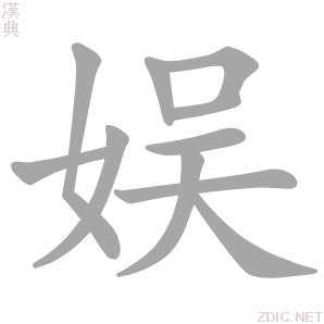 常标 娱 基本解释基本字义 ● 娱 yúㄩˊ ◎ 快乐或使人快乐:~乐(lè ㄌㄜˋ)。~老(欢度晚年)。~亲(使父母快乐)。~悦。自~。~情陶性。 英语 pleasure, enjoyment, amusement 德语 unterhalten, belustigen 法语 réjouir,se distraire,plaisir,distraction 娱 详细解释详细字义 ◎ 娱yú 〈形〉 (1) (形声。从女,吴声。本义:快乐,欢娱) 同本义 [amusement;joy;pleasure] 娱,乐也。——《说文》。经传多以虞为之。 夏康娱以自纵。——《楚辞·离骚》 穷身极娱。——张衡《西京赋》 诸侯不娱。——《周书·程典》 朝野多欢娱。——张景阳《咏史诗》 (2) 又如:娱娱(喜乐的样子);娱快(欢快,愉快);娱玩(玩乐);娱放(娱恣,纵情欢乐);娱笑(欢笑和悦);娱嬉(戏乐);娱戏(娱乐游戏) 词性变化 ◎ 娱yú 〈动〉 (1) 戏乐,使欢乐 [give pleasure to;amuse;enliven] 羌声色兮娱人。——《楚辞·九歌·东君》 设张辟以娱君兮。——《楚辞·九章·惜诵》 以相娱乐。——《史记·廉颇蔺相如列传》 无所娱遣。——清· 袁枚《祭妹文》 (2) 又如:娱神悦目(欣赏美好景物,使精神愉快);娱老(娱悦地欢度晚年);娱志(娱悦心志);娱亲(使父母欢乐);娱妻弄子(和妻子儿女玩乐) (3) 排遣,抒发 [divert oneself from loneliness or boredom] 遵江夏以娱忧。——《楚辞》 (4) 又如:娱哀(排遣哀伤);娱悲(排遣悲伤);娱忧(排遣忧愁);娱志(寄托高尚的志向);娱喜(消遣嬉戏) 常用词组 娱乐娱乐场娱遣娱心娱悦 【丑集下】【女】娛·康熙筆画:10 ·部外筆画:7 娛 《康熙字典》(康熙字典未收录“娱”字头,请参考“娛”字。)【丑集下】【女】娛·康熙筆画:10 ·部外筆画:7 【廣韻】【集韻】【韻會】元俱切【正韻】牛俱切, 又【集韻】五故切,音悟。義同。 虞㥥通。 【卷十二】【女】 娛 《说文解字》(说文解字未收录“娱”字头,请参考“娛”字:)【卷十二】【女】 『說文解字』 樂也。从女吳聲。噳俱切 『說文解字注』 樂也。古多借虞爲之。从女。吳聲。虞俱切。五部。 娱 音韵方言国际音标jy˧˥ 唐代读音ngio 粤语jyu4 近代音中古音疑母虞韻平聲虞小韻遇俱切三等合口;疑母暮韻去聲誤小韻五故切一等合口;上古音黄侃系统:疑母模部 ;王力系统:疑母魚部 ; 韵书 上古音 中古音 娱 字源字形字源演变 重定向至「娛」。