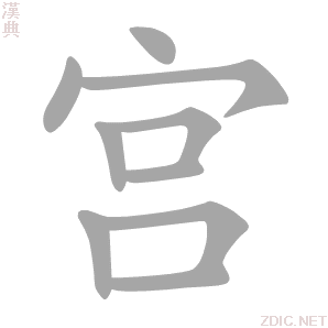 英语 palace 德语 Palast(S),Gong(Eig, Fam),Palastbezirk; Festungsbezirk (im chinesischen Schach) 法语 palais,temple 宫 详细解释详细字义 ◎ 宫gōng 〈名〉 (1) (象形。甲骨文字形,象房屋形。在穴居野处时代也就是洞窟。外围象洞门,里面的小框框象彼此连通的小窟,即人们居住的地方。本义:古代对房屋、居室的通称(秦、汉以后才特指帝王之宫)) (2) 同本义 [house] 宫,室也。——《说文》 宫谓之室,室谓之宫。——《尔雅·释宫》 古者贵贼同称宫。秦汉以来,惟王者所居称宫焉。——《释文》 父子皆异宫。——《礼记·内则》 上入执宫功。——《诗·豳风·七月》 后世圣人易之以宫室。——《易·系辞下》 且许子何不为陶冶,舍皆取诸其宫中而用之?——《孟子·滕文公上》 父母闻之,清宫除道,张乐设饮,郊迎三十里。——《战国策·秦策一》 父母妻子,皆同其宫。——《墨子·号令》 君宫中积珍宝,狗马实外厩,美下充下陈,君家所寡有者,以义耳。——《战国策·齐策》 (3) 又如果宫室对举,则宫指整所有围墙围着的房子,室指其中的一个居住单元(room)。如:宫柯(屋子;家里。宫:古代房屋的通称);宫庭(房屋之中);宫墙(房屋的围墙) (4) 秦汉以来,宫指宫廷,帝王的住所 [court] 愿令得补黑衣之数,以卫王宫。——《战国策·赵策》 沛公入 秦宫。——《史记·留侯世家》 宫中府中,俱为一体。——诸葛亮《出师表》 作宫阿旁,故天下谓之阿房宫。——《史记·秦始皇本纪》 宣德间,宫中尚促织之戏,岁征民间。——《聊斋志异·促织》 (5) 又如:宫嫔(宫廷中的女官);宫漏(宫廷里计时用的漏壶);宫众(保卫王宫的官吏的子弟) (6) 神仙的居处 [palace]。如:蓬莱宫;天宫;宫神(守卫天宫的门神)。又指文化活动或娱乐的场所。如:少年宫;文化宫 (7) 五音之一。最古的音阶仅用五音,即宫、商、角、徵、羽。古人通常以宫作为音阶的第一级音 [one of the five notes of the ancient Chinese five-tone scale, corresponding to I in numbered musical notation] 鼓宫宫动,鼓角角动,音律同矣。——《庄子·徐无鬼》 (8) 又如:宫商(中国古代五声音阶中的第一、第二两个音阶。常用以代指音乐);宫调(古代乐曲曲调的总称。凡以宫为主的调式为“宫”;又凡以商、角、变徵、徵、羽、变宫为主的格式为“调”,统称为“宫调”);宫商角徵羽(古代五声音阶的名称) (9) 借指帝王 [emperor]。如:宫宇(帝王所居位的宫室殿宇);宫车晏驾(皇帝死亡的讳辞。晏:晚);宫仗(帝王的仪仗) (10) 太子 [crown prince]。如:宫保(即太子少保,二品官阶,可用一品顶戴。称有宫保街的巡抚,是表示尊重);宫坊(青宫与春坊。青宫为太子的居处,春坊为太子的官属,合指太子的官署) (11) 借指后妃 [empress and imperial concubines]。如:宫主(古代高丽国臣民对本国后妃的称呼);宫眷(后妃的统称);宫卿(大长秋。皇后宫中的高级近侍);宫眷(本指宫帷,借指嫔妃) (12) 以十二个黄道座的位置作为标志的黄道十二宫之一 [sign] (13) 宗庙,神殿,供神的大建筑物 [temple] 于是郡国各除道,缮治宫观名山神祠所,以望幸矣。——《史记·封禅书》 (14) 又如:雍和宫;宫馆(祠庙);宫庙(犹宗庙) (15) 妇女子宫的省称 [womb]。如:扩宫;宫颈 (16) 古代五刑之一。阉割男子生殖器 [castration] 宫辟疑赦。——《书·吕刑》《传》:“宫,淫刑也。男子割势,妇人幽闭。” (17) 又如:宫者(受过宫刑的男子);宫罪(宫刑);宫割(施以宫刑);宫墨(宫刑与墨刑的并称);宫罚(宫刑) (18) 古代贵族妇女的卧室 [boudoir] 以阴礼教六宫。——《周礼》 (19) 通“躬”。身体 [body] 余左执鬼中,右执殇宫。王念孙云:中、宫皆身也。——《国语·楚语上》 (20) 通“官”( guān)。官府,官舍 [local authorities;feudal officials] 甸粟而内之三宫。——《谷梁传·桓公十四年》 县治宫储,设共具而望幸。——《汉书·食货志下》 (21) 又如:宫府(官府) 词性变化 ◎ 宫gōng 〈动〉 (1) 居住;栖息 [house] 若但竖数十屋而宫,群数十士而饭,而曰教养尽是矣,何其易也!——宋· 叶适《瑞安县重修县学记》 (2) 营建宫室房屋 [build] 重门城,昔齐王芳为 司马师废之,宫于此。——《水经注》 (3) 围绕 [surround] 君为庐宫之。——《礼记》 大山宫小山,霍。——《尔雅·释山》。疏:宫犹围绕也。谓小山在中,大山在外围绕之,山形若此者名霍 常用词组 宫车宫灯宫殿宫调宫娥宫观宫禁宫颈宫女宫阙宫室宫廷宫廷政变宫外孕宫刑宫苑宫掖宫妆,宫装 【寅集上】【宀】宮·康熙筆画:10 ·部外筆画:7 宮 《康熙字典》(康熙字典未收录“宫”字头,请参考“宮”字。)【寅集上】【宀】宮·康熙筆画:10 ·部外筆画:7 【唐韻】居戎切【集韻】【韻會】居雄切【正韻】居中切, 又【禮·儒行】儒有一畝之宮。【註】宮,牆垣也。【儀禮·士昏禮】母戒女曰:夙夜無違宮事,古者貴賤所居,皆得稱宮,至秦始定爲至尊所居之稱。 又宗廟亦曰宮。【詩·召南】于以用之,公侯之宮。【孔氏曰】可以奉祭祀曰事,祭必於宗廟曰宮,互見其義也。 又學名。【禮·曲禮】諸侯曰頖宮。【註】謂半於天子之宮也。 又官名。【周禮·天官】宮正掌王宮之戒令糾禁。 又五音中聲曰宮。【前漢·律歷志】宮,中也。居中央,暢四方,倡始施生,爲四聲綱。【史記·樂書】宮,土音,聲出於 又腐 又環也。【爾雅·釋山】大山宮,小山霍。【註】宮謂圍繞之。禮記曰:君爲廬宮之是也。 又【周禮·春官·小胥】正樂縣之位,天子宮縣。【註】宮