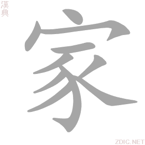 其它字义 ● 家 jie •ㄐㄧㄝ ◎ 词尾,同“价”:整天~。成年~。 英语 house, home, residence; family 德语 Familie, Haushalt (S),Zuhause (S),ZEW für Geschäft, Restaurant, Hotel, Unternehmen, Institution etc. (Zähl) 法语 famille,foyer,maison,domicile,(suffixe pour les experts, spécialistes, ...),(classificateur pour établissements divers : magasins, restaurants, hôtels, cinémas, ...) 家 详细解释详细字义 ◎ 家gū 〈名〉 (1) 古通“姑”[the mother of one's husband]。如:阿家(称婆婆);阿家阿翁 (2) 另见 jiā 基本词义 ◎ 家jiā 〈名〉 (1) (会意。甲骨文字形,上面是“宀”( mián),表示与室家有关,下面是“豕”,即猪。古代生产力低下,人们多在屋子里养猪,所以房子里有猪就成了人家的标志。本义:屋内,住所) (2) 同本义 [home;domicile;dwelling place] 家,居也。从宀,豭省声。——《说文》 家人内也。——《易·杂卦传》 上地家七人。——《周礼·小司徒》。注:“有夫有妇,然后为家。” 夙夜浚明有家。——《书·皋谟》 开国承家。——《易·师》 室为夫妇所居,家谓一门之内。——《诗·周南·桃夭》注 便要还家,设酒杀鸡作食。——陶潜《桃花源记》 (3) 引申表示住宅、房屋 [house;residence] 平原君家楼临民家。——《史记·平原君虞卿列传》 (4) 又如:家堂(正屋中间的堂屋);家所(家居处所);家堂菩萨(家中供奉的佛祖神灵);家第(家宅;私邸);家间(家里;家中)。借指部队或机关中某个成员工作的处所。如:连长开会去了不在家;所长在家主持工作 (5) 家庭,人家 [family] 数口之家,可以无饥矣。——《孟子·梁惠王上》 治天下之国若治一家。——《墨子·尚同下》 家半三军。——《国语·晋语》 视吾家所寡有者。——《战国策·齐策四》 长铗归来乎,无以为家! 家绘像祀之。——《明史》 (6) 又如:养家;持家;安家;家第(对对方家庭的敬称);家数(家族;武艺招数、招式);家庙(供奉祭祀祖先的祠堂);家缘(家业,家产);家私(家产);家赀(家私财产);家计(家业,家产) (7) 指夫或妻 [husband or wife] 女有家,男有室,无相渎也。——《左传·桓公十八年》 固乱流其鲜终兮,浞又贪夫厥家。——《楚辞·离骚》 (8) 又如:家婆(家主婆;当家婆);家公(丈夫);家花(喻自己的妻子);家婆(妻子;主妇) (9) 家家;每家 [every family]。如:家户(每家每户,家家户户);家至户到(到每家每户;遍及每家每户) (10) 大夫统治的政治区域,即卿大夫或卿大夫的采地食邑 [minister and high official or theirs feud] 丘也闻有国有家者。——《论语·季氏》 王曰:何以利吾国?大夫曰:何以利吾家?——《孟子·梁惠王上》 (11) 又如:家甲(古时卿大夫的私人武装);家主(春秋时对卿大夫的称谓);家老(上古大夫家臣中的长者);家臣(春秋时各国卿大夫的臣属);家邦(本指家和国,亦泛指国家);家国(家与国,亦指国家) (12) 娘家 [married woman's maiden home] 卿但暂还家。——《玉台新咏·古诗为焦仲卿妻作》 谢家来贵门。 今日还家去。 且暂还家去。 (13) 学术或艺术流派 [school] 焚百家之言,以愚黔首。——贾谊《过秦论》 (14) 又如:家数(流派风格;家法传统。多用于诗、文、技艺等);家言邪学(自成一家的偏见。儒家指儒家以外的学说) (15) 经营某种行业的人家或具有某种身分的人 [a person or family engaged in a certain trade] 农家少闲月。——白居易《观刈麦》 (16) 又如:农家;厂家;渔家;行家;东家;庄家 (17) 掌握某种专门学识或从事某种工作、担任某种职务的人 [expert;specialist in a certain field] 地学之家。——[英]赫胥黎著、 严复译《天演论》 (18) 又如:政治家;艺术家;专家;科学家;社会活动家;作家 (19) 民族 [nation]。如:苗家;侗家;傣家 (20) 指某一集团或某一方面 [group]。 如: 三家条约 (21) 家财,财产 [property] 皆没其家而迁之蜀。——《史记·吕不韦列传》 (22) 又如:分家;发家;家破人亡;抄家 (23) 朝廷 [court] 争先入公家。——《吕氏春秋·贵卒》。注:“公之朝也。” (24) 又如:汉家(即汉朝);随家(即隋朝);家历(皇朝的历数) (25) 都城 [capital] 其国家,宫室、车旗、衣服、礼仪,皆以九为节。——《周礼》。郑玄注:“国家,国之所居,谓城方也。” 紫泉宫殿锁烟霞,欲取 芜城作帝家。—— 唐· 李商隐《隋宫》 (26) 帝王或太子 [emperor] 三家,三皇也。——《后汉书·马融传》注 (27) 又如:家吏(皇后或太子的官属) (28) 某人 [a person]。如:家伙;家头(一个人叫一家头) (29) 古代医书上指患某种病的人 [patient] 喘家,作桂枝汤,加厚朴、杏子佳。——《伤寒论》 (30)“傢”的古字 [utensil]。如:家生;家伙点(锣鼓家什的节奏);家器(家庭日常用具) 词性变化 ◎ 家jiā 〈形〉 (1) 人工饲养或驯养在家中的。与“野”相对 [domestic]。如:家羽(家养的鸟);家兔;家禽;家兽(人类为了经济或其它目的而驯养的兽类,如猪、牛、羊、马、骆驼、家兔、猫、狗等) (2) 私家的,个人的 [individual],与“公”相对 今大道既隐,天下为家。——《礼记·礼运》 家祭勿忘告乃翁。——陆游《示儿》 (3) 我的 [my]——谦辞,用于对别人称自己的辈分高或年纪大的亲属 。如:家父家母(对人称自己父母的谦词);家岳(对人称自己的丈人);家尊(称自己的父亲,家父);家堂(对母亲的称呼) (4) 内部的;家中的 [internal]。与“外”相对。如:家生哨(亦作“家中哨”、“家生肖”。詈词。犹言家盗内贼);家贼(家庭内部的败类。亦指汉奸) ◎ 家jiā 〈量〉 用来计算家庭或企业的多少。如:三家商店;两家人家 ◎ 家jiā 