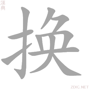 英語 change 德語 tauschen, austauschen, umtauschen(V),wechseln, umwechseln, einwechseln(V) 法語 échanger,troquer,changer,convertir 换 詳細解釋詳細字義 ◎ 換huàn 〈動〉 (1) (形聲。從手,奐( huàn )聲。本義:互易) (2) 同本義 [trade;exchange;barter] 換,易也。——《說文》 擅相換易。——《穀梁傳·桓公元年》注 (3) 又如:以帛換酒;換過子(互相調換);換了帖(異姓的人結拜爲兄弟時交換寫有年齡、籍貫、家世等的帖子) (4) 變易,改變 [change] 幾移幾換。——[英]赫胥黎著、 嚴復譯《天演論》 (5) 又如:換衣服;換手(更換操作的人);換腳手(換鞋、衣服、手套等);換易(調換、更換);換朝(改朝換代) 常用詞組 換班換茬換代換防換崗換個兒換工換骨奪胎換肩換流換馬換毛換親換取換人換算換算表換湯不換藥換帖換文換洗換心換牙換言之換樣,換樣兒換喻換約 【卯集中】【手】換·康熙筆画:13 ·部外筆画:9 換 《康熙字典》(康熙字典未收錄“换”字頭,請參考“換”字。)【卯集中】【手】換·康熙筆画:13 ·部外筆画:9 【廣韻】【集韻】【韻會】【正韻】 又【前漢·敘傳】項氏畔換。【註】孟康曰:畔,反也。換,易也。師古曰:畔換,强恣貌。猶言跋扈也。【左思·魏都賦】雲散叛換。【註】叛換,猶恣睢也。【集韻】作愌。 又于眷切,音院。【蘇轍·送孫提 【卷十二】【手】 換 《说文解字》(說文解字未收錄“换”字頭,請參考“換”字:)【卷十二】【手】 『說文解字』 易也。从手奐聲。胡玩切 『說文解字注』 易也。从手。奐聲。胡玩切。十四部。 换 音韻方言国际音标xuan˥˧ 日语读音KAERU KAWARU韩语罗马HWAN 粤语wun6 韵书 上古音 中古音 换 字源字形字源演變 重定向至「換」。