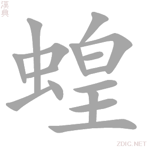 【申集中】【虫】蝗·康熙筆画:15 ·部外筆画:9 蝗 《康熙字典》【申集中】【虫】蝗·康熙筆画:15 ·部外筆画:9 【唐韻】【集韻】【韻會】【正韻】 又【唐韻古音】戸盲切,音橫。《演春秋繁露》云:徽州稻苦蟲害,俗呼橫蟲。 又【韻會】戸孟切,橫去聲。義同。 【卷十三】【虫】 蝗 《说文解字》【卷十三】【虫】 『說文解字』 螽也。从虫皇聲。乎光切 『說文解字注』