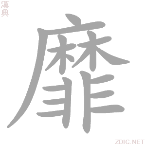 英语 divide, disperse, scatter 法语 prodigue,dissiper,extravagant,ne pas 靡 详细解释详细字义 ◎ 靡mí 〈名〉 通“湄”。水边,河岸 [bank of waters] 明月珠子,玓瓅江靡。——《史记·司马相如列传》 词性变化 ◎ 靡mí 〈动〉 (1) 浪费 [waste] 而百姓靡于外。——《战国策·秦策》 国家靡敝。——《礼记·少仪》。疏:“谓财物糜散凋敝。” 不随俗靡。——宋· 司马光《训俭示康》 靡之者。——汉· 贾谊《论积贮疏》 (2) 又如:奢靡;靡货(奢侈品);靡靡(华丽而堂皇);靡丽(奢华,美盛) (3) 消失 [die out] 喧杂杂鸟声多,静悄悄人事靡。——《西游记》 (4) 又如:靡散(消灭);靡碎(散碎) (5) 通“糜”。烂 [rot;fester] 子胥靡。——《庄子·胠箧》 (6) 通“摩”。切磋,研究 [compare notes;research] 身日进于仁义而不自知也者,靡使然也。——《荀子·性恶》 (7) 摩擦,接触 [rub;scrape] 喜则交颈相靡。——《庄子·马蹄》 (8) 另见 mǐ 常用词组 靡费 基本词义 ◎ 靡mǐ 〈动〉 (1) (形声。从非,麻声( mǐ)。本义:无;没有) (2) 同本义 [no;not]。 靡,无也。——《尔雅》 靡室靡家。——《诗·小雅·采薇》 靡日不思。——《诗·邶风·泉水》 靡不有初。——《战国策·秦策》 靡计不施。——《聊斋志异·促织》 靡不毕现。——《史记·屈原贾生列传》 (3) 又如:靡有孑遗(没有遗漏,一点儿不剩) (4) 散乱;顺风倒下 [disperse;blown away by the wind] 望其旗靡。——《左传·庄公十年》 左右皆靡。——《史记·廉颇蔺相如列传》 汉军皆披靡、分散之貌。——《史记》 利夫秋豪害靡国家。——《荀子·大略》。注:“披靡也。” 虫尽靡。——《聊斋志异·促织》 (5) 又如:风靡;委靡;披靡,靡拉(毁损破坏);靡披(草木随风所至,无不倒伏);靡徙(失正,抑退的样子);靡敝(衰败,败坏);靡然(随风披靡的样子) (6) 蔓延 [spread]。如:靡迤(绵延不绝的样子) 词性变化 ◎ 靡mǐ 〈形〉 (1) 细腻;细密 [meticulous] 靡颜腻理。——《楚辞·招魂》 (2) 又如:靡密(细密,细致):靡曼(肌理柔腻细致);靡颜腻理(形容美人容颜姣妍,肌肤细腻) (3) 华丽,美好 [tender;fine] 不侈于后世,不靡于万物。——《庄子·天下》 (4) 又如:靡曼(柔弱,柔美,华丽) (5) 缓 [slow] 行迈靡靡。——《诗·王风·黍离》 (6) 又如:靡迤(小步而行);靡靡(迟缓的样子;柔和的乐音) (7) 另见 mí 常用词组 靡及靡靡之乐靡衣玉食 靡 國語辭典动