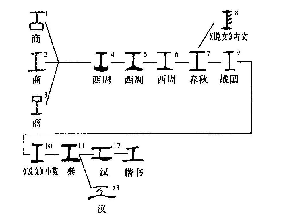 象形字。像古代画直角或方形的工具曲尺。象形的“工”字在殷商晚期已经简化,把原来一端的方框形收缩为一横,同现代写法已没有什么区别。但在西周中期以前的金文中,还能见到早期象形字的遗迹,即下底肥厚,经过了 ——李学勤《字源》 |