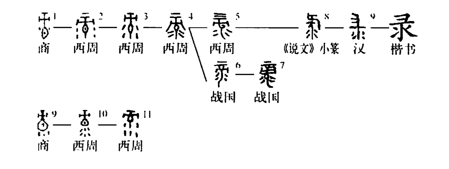 ”作“ ”,像用辘轳汲水之形,应为“辘”字的象形初文。“辘”古音亦为来纽、屋部字,与“录”同音,故可通假。金文字形基本相同。后来演变为“ ”和“ ”,象形意味稍有减弱。《说文》小篆即从此字形演变而来。对于“录”的造字本义,《说文》:“录,刻木录录也。象形。”未免解说有误。甲骨文假借为“山麓”之“麓”:“辛酉,王田于鸡录。”(《合集》37848)金文通用为“福禄”之“禄”。 钟:“授余纯鲁、通录(禄)、永令(命)、眉寿、灵终。”(《集成》1.247)今也用为“録”的简化字。(王志平)