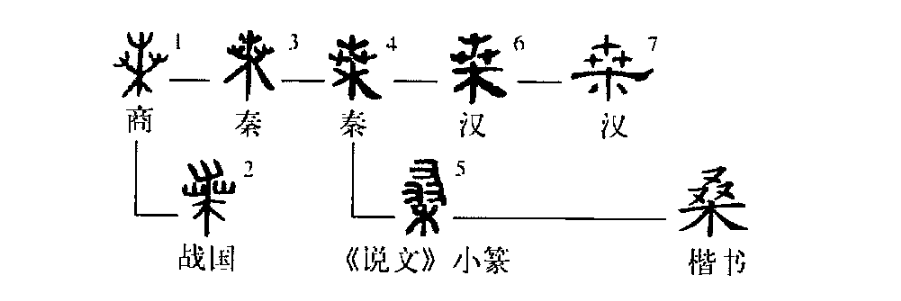 ,像桑树之形。战国文字作 ,两侧的枝叶与树形脱离。至秦代文字(字形4)及《说文》小篆,枝叶已完全与树形脱离,前者变从“芔”,后者变从“叒”。“桑”,本义是桑树。《说文》:“桑,蚕所食叶木。”《诗·小雅·小弁》:“维桑与梓,必恭敬止。”朱熹集传:“桑、梓二木,古者五亩之宅,树之墙下,以遗子孙给蚕食、具器用者也。” (按:后世以“桑梓”为故里,源出于此。)晋陶潜《归园田居》五首之二:“相见无杂言,但道桑麻长。”也指桑叶。《诗·卫风·氓》:“桑之落矣,其黄而陨。”汉王充《论衡·商虫》:“夫虫食谷,自有止期,犹蚕食桑,自有足时也。”引申指采桑。《诗·魏风·十亩之间》:“十亩之间兮,桑者闲闲兮。” 《汉书·外戚传·元后》:“率皇后列侯夫人桑。”颜师古注:“桑,采桑也。”又指种桑养蚕。《汉书·食货志上》:“故务民于农桑,薄赋敛,广蓄积,以实仓廪。”(冀小军)——李学勤《字源》