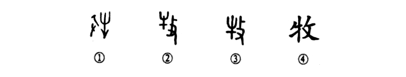 “借问酒家何处有?牧童遥指杏花村。”这就是“牧童”的“牧”字。这个字很形象,①是甲骨文的形体,其左是一只手拿着鞭子,其右是迎面看的牛头的形象(代表牛)。这就是拿鞭子赶牛,表示放牧的意思,可见“牧”字是个会意字。金文②的左边是“牛”,右边是手拿鞭子的形象,所以甲骨文的左边和金文的右边都是个“攴”字。小篆③是随金文的形体演变而来的。楷书④的左边看不出像“牛”,右边也没有手执皮鞭的模样了,不过从其组成部分来看,是完全一致的。