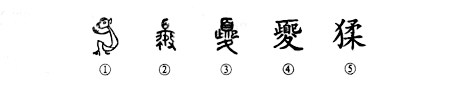 细说汉字:猱 这个“猱”字读作náo,本为象形字。①是甲骨文的形体,是猿类动物,身体便捷,善于攀援。②是金文的形体,变得不像了。③是小篆的写法。④为楷书的写法。⑤为后世通行楷书体,变象形为形声。《说文》:“夒(猱),贪兽也,一曰母猴,似人。”关于“母猴”的说法不妥。“猱”的本义就是一种猿猴,如《诗经•小雅•角弓》:“毋教猱升木。”意思是猿猴上树不用教。又如《冯婉贞》:“猱进鸷(zhì)击。”“鸷”是鹰类的猛禽。这是说:像猴子那样敏捷地进攻,像鸷鸟那样勇猛地搏击。象形字。像猕猴形。《说文》训夒为“贪兽也。一曰母猴”。母猴亦作猕猴解,因为象形字有局限,无法表示其性别。在商代甲骨文中,夒有勾勒形与单纯线条形之別。甲骨文夒为侧立之形,除表现猕猴头部有耳、目、口,身体上有又(手)、下有止(足)之外,还着意表示有尾之形。偶或省略尾形,字亦可识,但不属于标准写法。周代夒字写法出现繁复变化。甲骨文夒用做高祖名,学者多以为指帝喾。西周金文夒或假为擾, 铭文记牧牛誓曰:“自今余敢夒乃小大史(事)”,意即从今天起我若是敢扰乱您的大小事情。(刘桓) ——李学勤《字源》