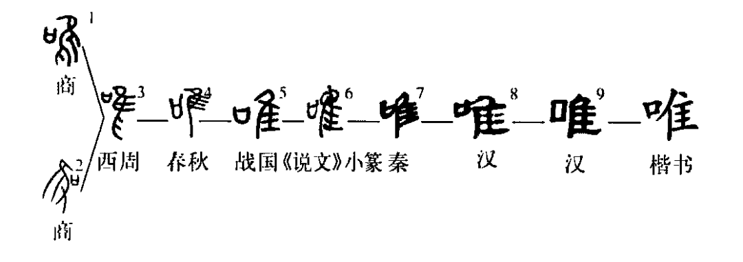 形声字。从口,隹声。其本义表示应答声,是一象声词,用于对尊长,表恭敬。《说文》:“唯,诺也。”《论语·里仁》:“子曰:‘参乎! 吾道一以贯之。’曾子曰:‘唯。’”用为此义读wěi。此义不见用于古文字资料,甲骨文、金文中经常作语词用,作强调话题的标志。《前》5.39.8 :“其唯太史寮令。”金文中多用于铭文开首引出时间。段簋:“唯王十又四祀十又一月丁卯。”传世文献中亦多用为虚词。(陈英杰) ——李学勤《字源》 |
