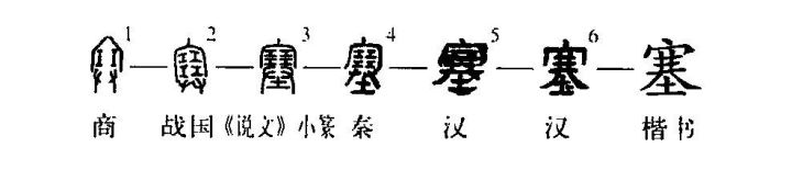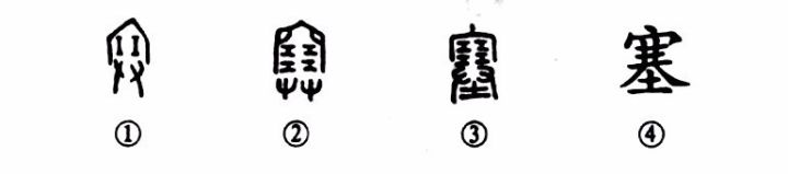 这是“塞向墐户”的“塞”字,是个会意字。甲骨文①的上部是个“宀”(房子)字,中间的两个“工”表示一堆东西,最下部是两只手,也就是用手把一堆东西塞到房子之中的意思。金文②则把甲骨文上部的“宀”改为“穴”,表示把洞塞好。③是小篆的形体,是在最下部又增加了个“土”字,这就表示把洞塞好以后再用土封上。④是楷书的形体,是由小篆演变来的。 “塞”字的本义是“堵塞”,应读为sāi(腮),如韩愈《原道》:“不塞不流,不止不行。”就是说:没有塞,也就无所谓流;没有止,也就无所谓行。由“堵塞”之义又可以引申为“遏止”,如《商君书•画策》:“善治者塞民以法。”大意是:善于治理国家的人,要用法来遏止百姓们的不法行为。因为要“塞住”的地方也往往是要害的地方,所以从“堵塞”之义又可以引申为“要塞”之义。这里的“塞”字应当读为sè(涩),如《汉书•晁错传》:“守边备塞,劝农利本,当世急务。”大意是:守备好边疆的要塞。鼓励农民搞好农业这个根本,这都是现迮廹切需要搞好的事情。 请注意:“塞”字在今天若干的书面语词中使用时,经常读为sè(涩),如闭塞、塞责等等。 ——左民安《细说汉字》 扩展阅读
